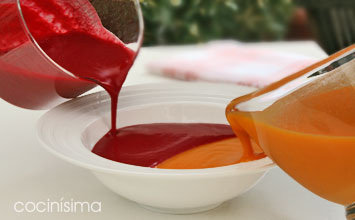 Para servirla utilizaremos dos jarras o similar una con la crema de calabaza y otra que lleve la crema con la remolacha y la vertemos simultáneamente en plato hondo con cuidado para que no se mezclen los colores.